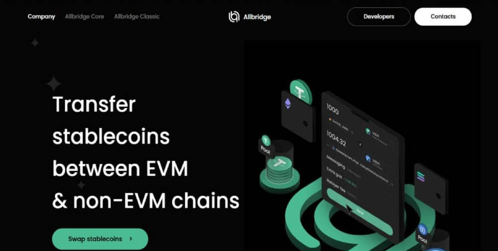 Visual representation of cross-chain transfers — “Transfer stablecoins between EVM & non-EVM chains” — as seen in Allbridge’s informational banner.