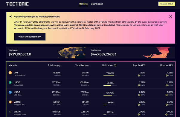 Tectonic dashboard snapshot showing total supply, borrowed volume, and utilization rates.