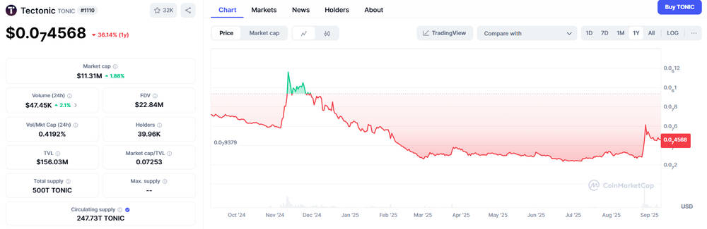 Live TONIC price, trading volume, and market cap data from CoinMarketCap.