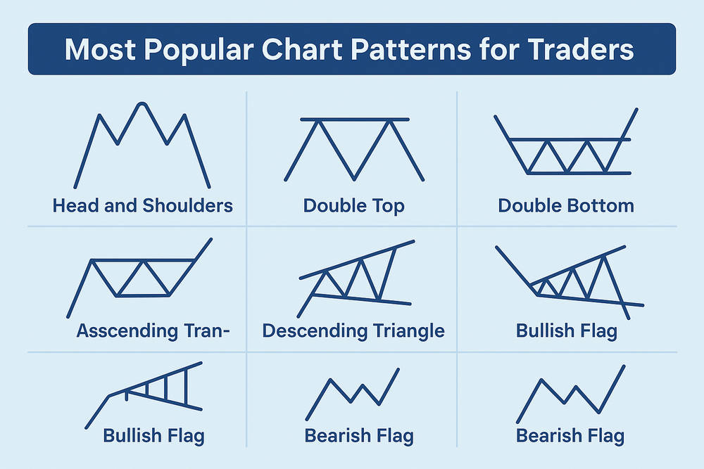 Long-term formations such as Head and Shoulders, Double Top, Double Bottom, Flags, and Triangles are included. These patterns help predict trend continuations or reversals.