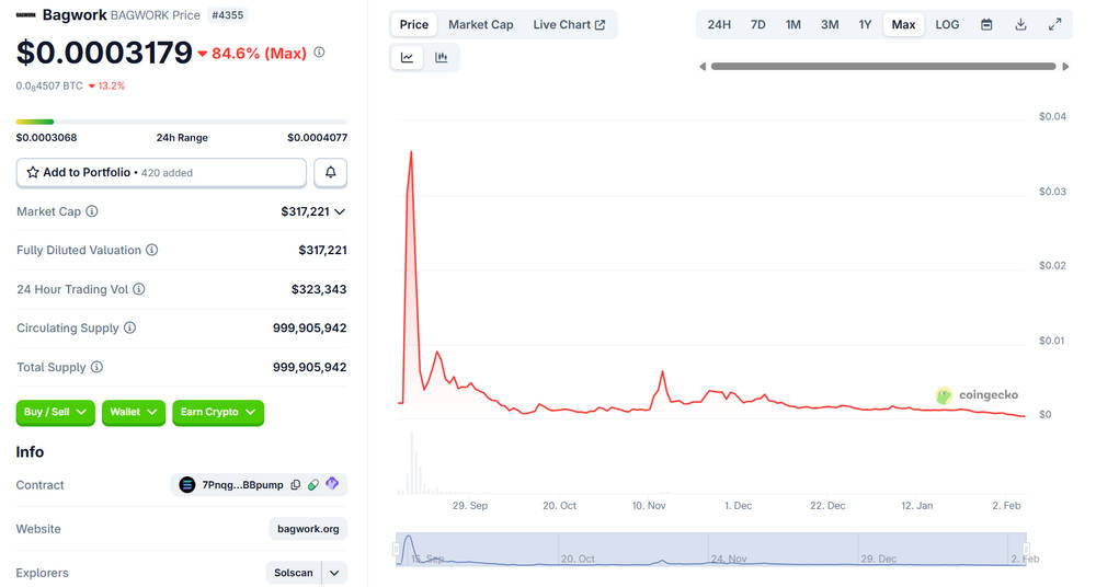 That matters because Bagwork crypto tokens from fair-launch environments often show fast early price discovery, then quieter periods where price can move sharply on relatively modest order flow.