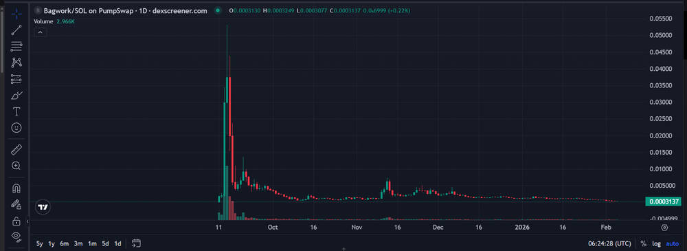 Bagwork (BAGWORK) is a Solana-based token that trades primarily through on-chain liquidity, so the Bagwork coin price in 2026 is best interpreted with volume and pool liquidity in mind, not just the chart.