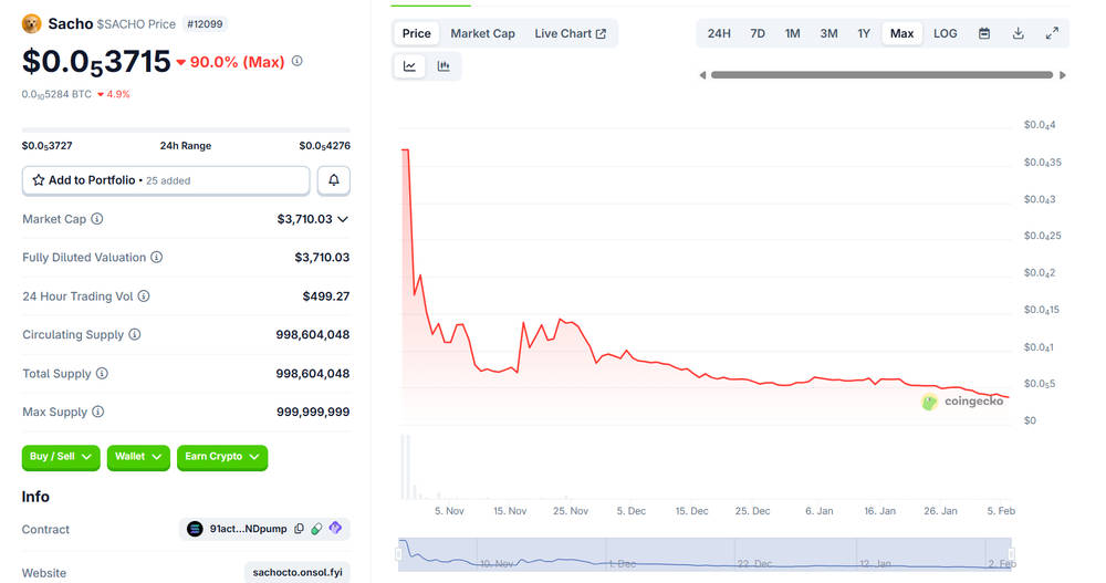 Sachocoin carries the typical risk profile of a micro-cap meme-category token: