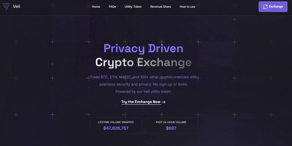 Veil exchange also publishes headline volume figures on its homepage (lifetime swapped and 24-hour volume). Treat these as self-reported indicators, not audited market stats.
