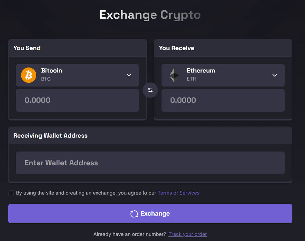 The core idea is straightforward. You pick the "You Send" coin, choose the "You Receive" coin, enter a receiving wallet address, and create an exchange order.